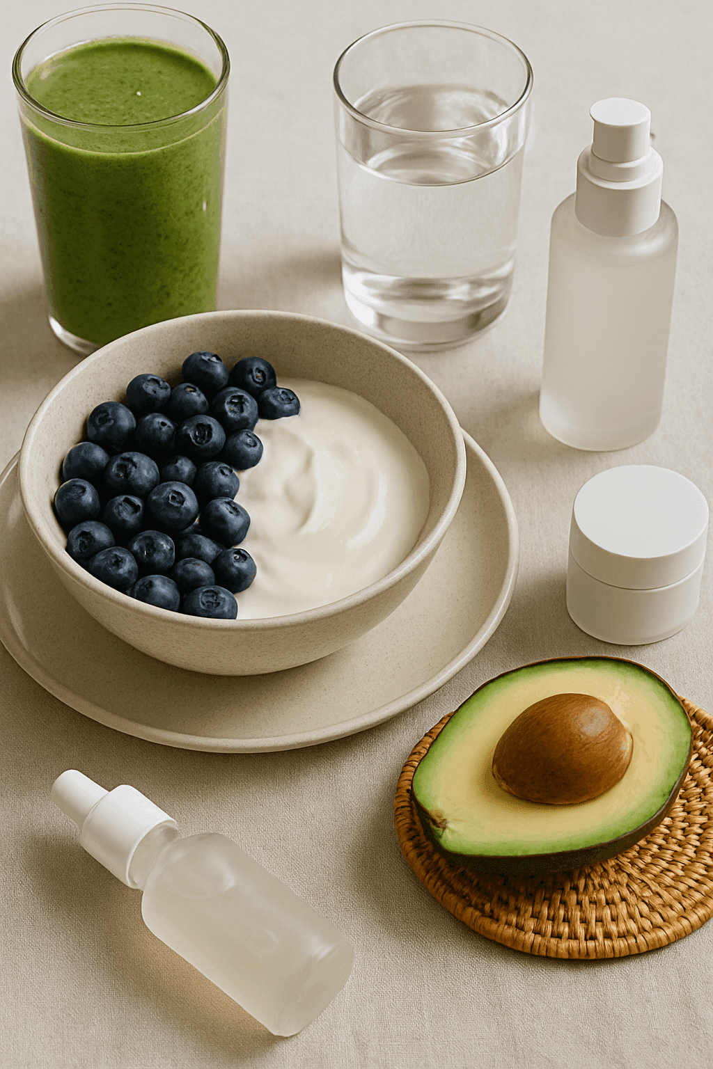 Piękna cera to efekt pracy całego organizmu. Dieta bogata w witaminy (A, C, E), minerały (cynk, selen), nienasycone kwasy tłuszczowe (omega-3) wspomaga regenerację i chroni przed fotostarzeniem. Latem warto spożywać dużo warzyw (szpinak, brokuły), owoców (jagody, maliny), orzechów, nasion chia i tłustych ryb (łosoś, makrela). Unikaj cukru, alkoholu i nadmiaru kofeiny, które odwadniają i sprzyjają stanom zapalnym skóry.